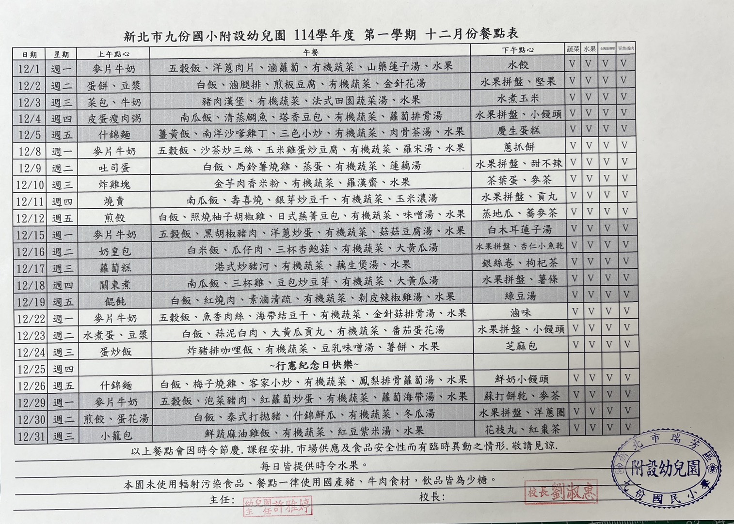 114學年度第一學期十二月份餐點表